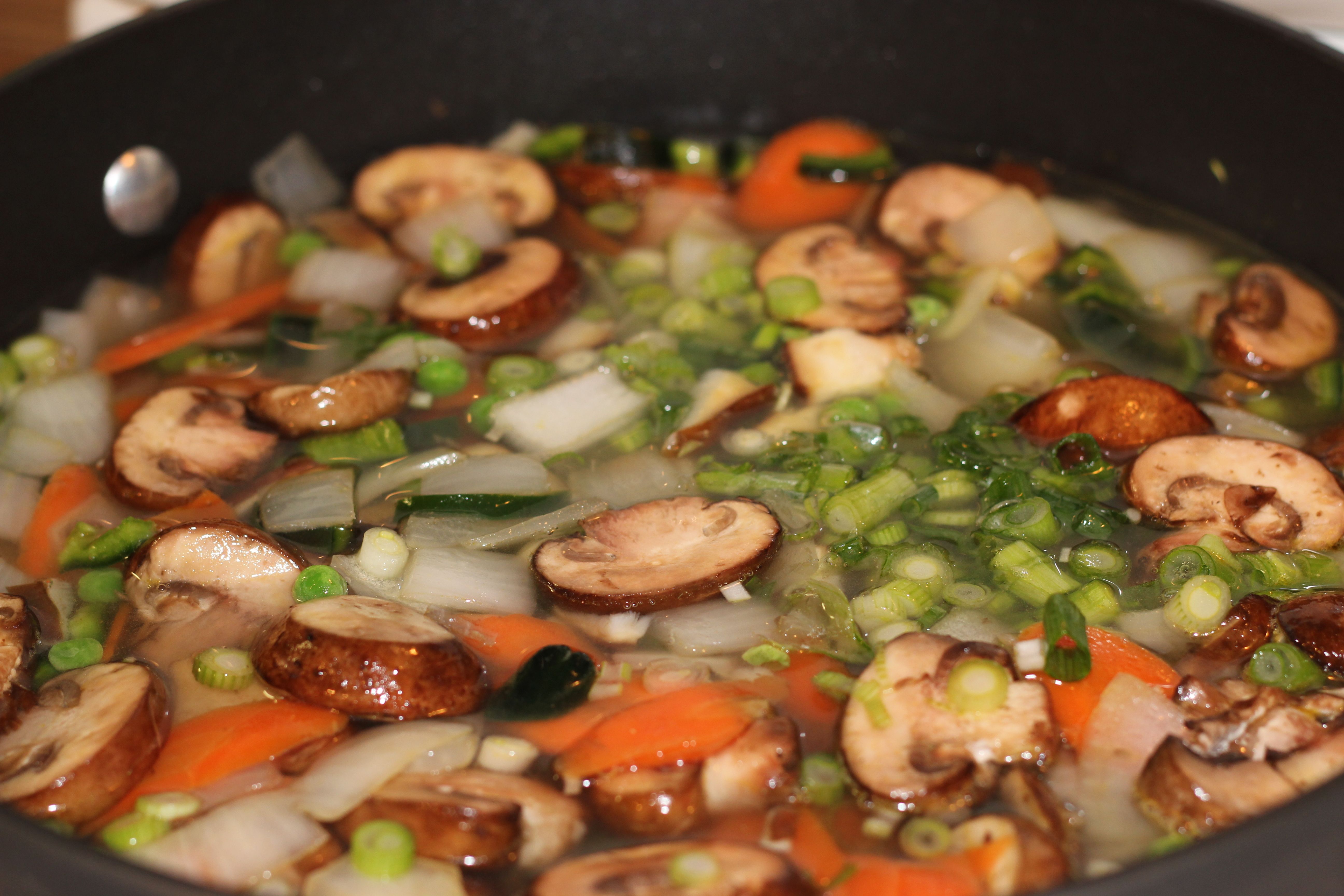 Blend a bunch of brown miso in some warm water with a mini whisk or fork. Add miso, sesame oil, and soy sauce to pot. Allow to simmer for a while. Taste and adjust flavors as needed. Of course, soups are always better the next day. We ended up adding sriracha to our individual bowls to make them a bit spicy.