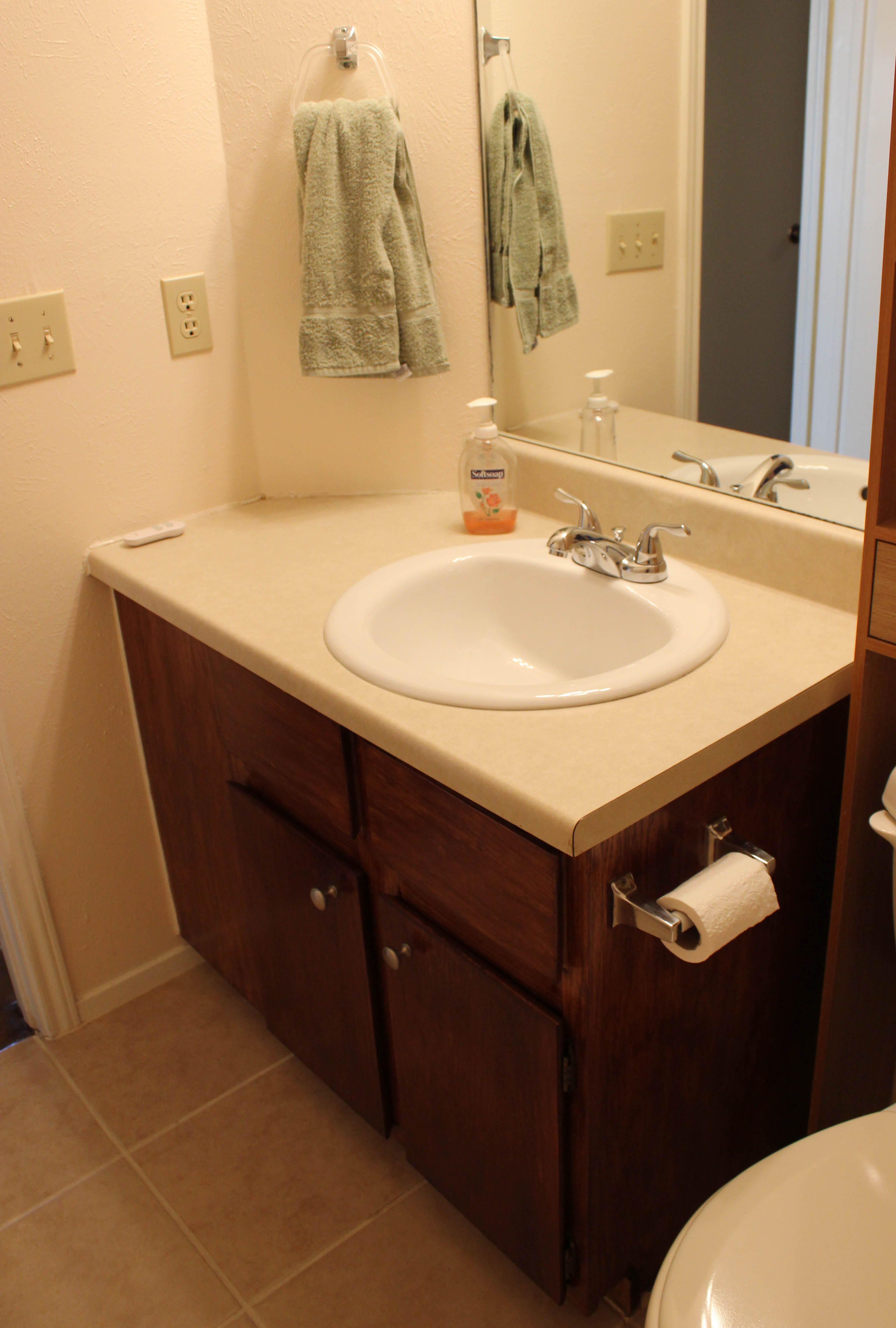 The finished product was a HUGE improvement. After replacing the light fixture, sink, faucet, and refinishing the cabinets we were a bit jealous that someone else got to enjoy our not so hard work. The upgrade was pretty cheap. The stain supplies ran less than $30 for two bathrooms and I had plenty of stain and polyurethane left over, currently being used on another project.