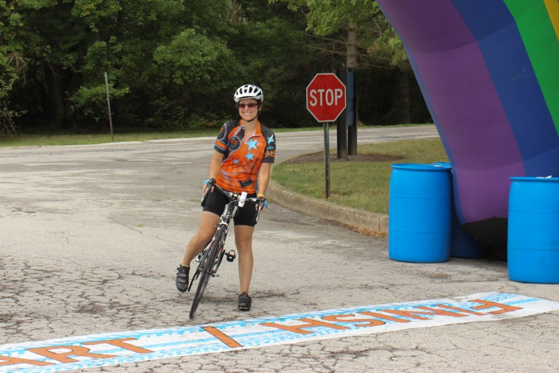 I eventually reached the finish line for Saturday after riding 101 miles. The finish line was marked with blue flags and balloons and loud music.