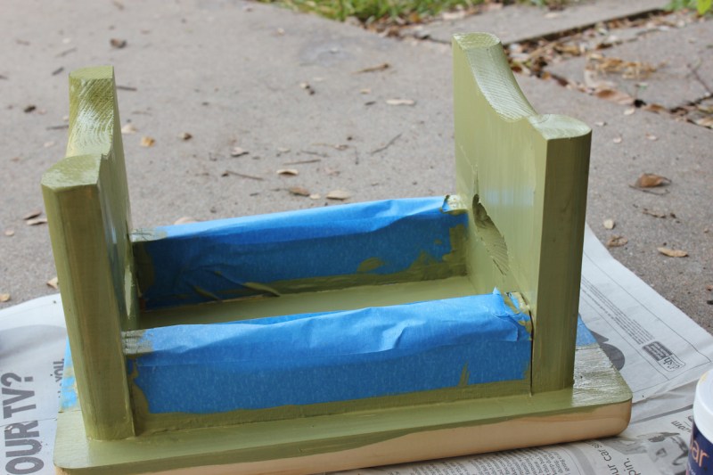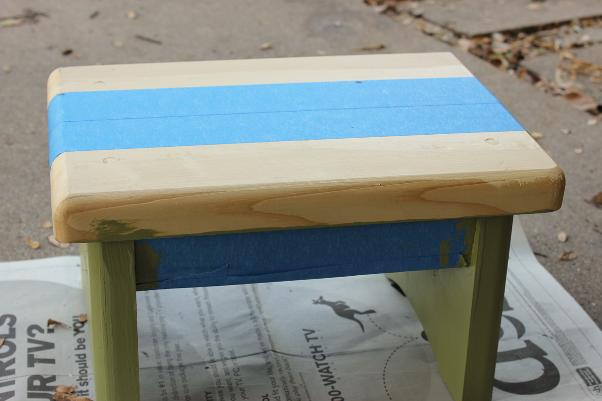 From previous painting projects, I have a ton of paint samples in a variety of colors. I decided to use those samples to paint my stool. I wanted to make it two colors, so I painted a stripe down the top of the stool in yellow, and the side supports underneath. After two coats dried, I taped over those parts so that I could paint the rest of the stool green.