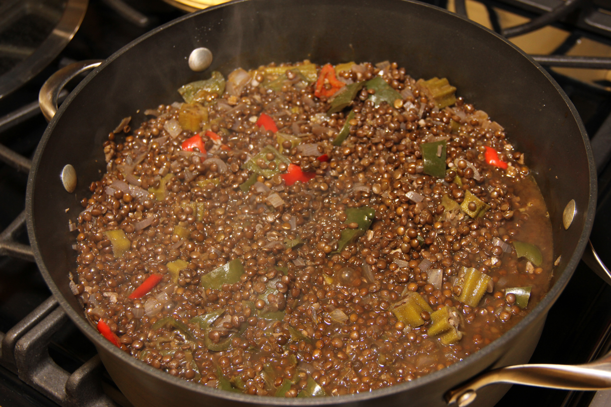 Next, deglaze the pan with sherry and add beluga (black) lentils. I had peppers from the garden so I threw those in to add some spice. Garden fresh okra also went into the pan.