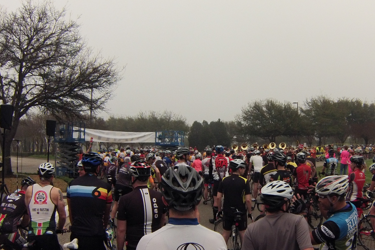 Saturday morning was dreary, and a bit damp. The traffic was bad getting into the ride at Samsung Semiconductor, so they started us 15 minutes late. At least we had the UT band to entertain us. You can see their tubas in the background. They played Can’t Hold Us by Macklemore and then I proceeded to have that song in my head for the entire 62 mile ride.