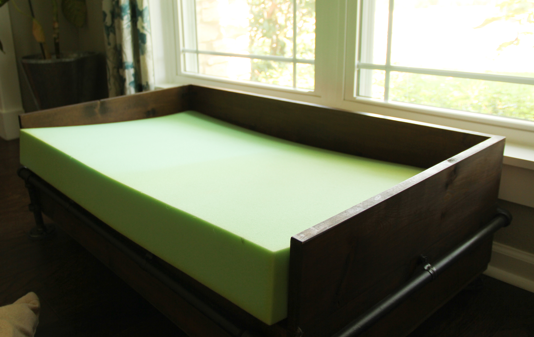 I bought one section of green foam that was the thickest they had, when it was on sale for 50% off. To make the bed thicker, I also bought two chair cushions that were about the right size. The thick foam wasn’t the right size to fit in the dog bed, so I had to cut it to size. It was so thick I had to cut the top half first and then the bottom half with my scissors.