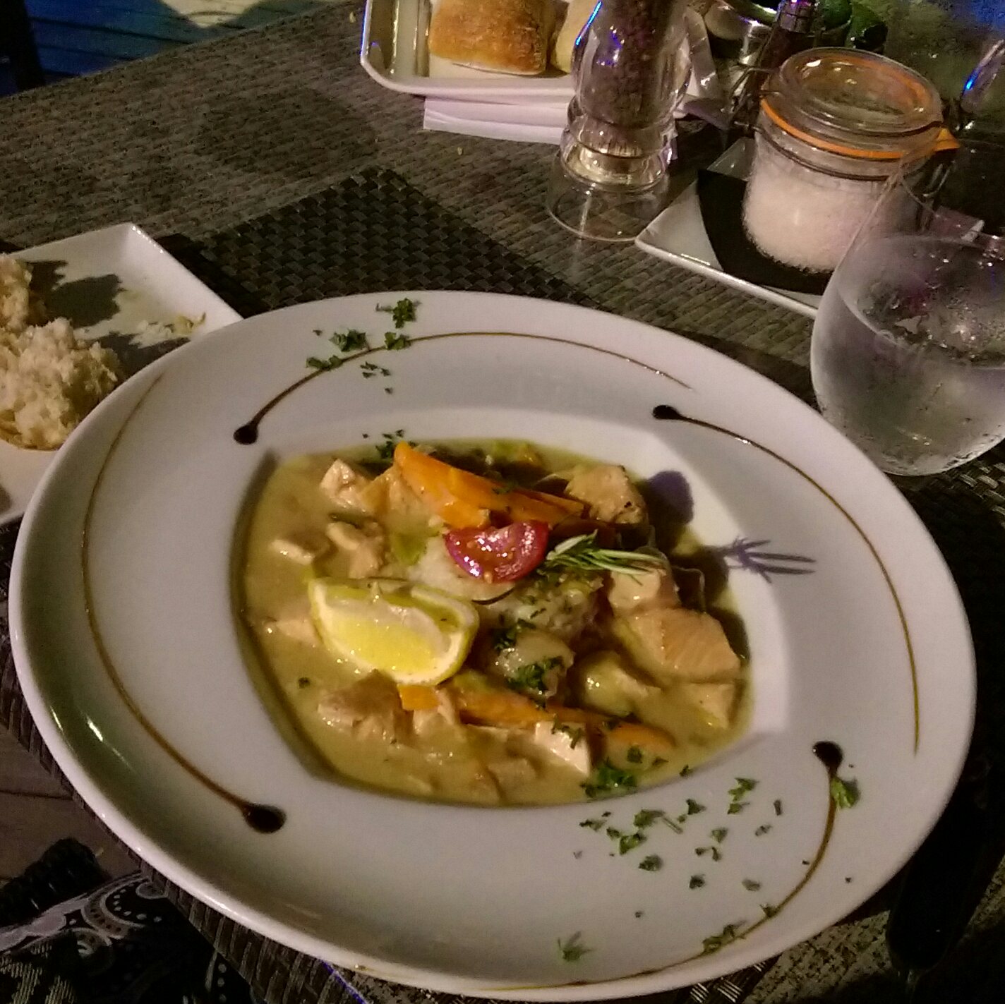 There are a number of interesting restaurants right down near the beach where we’re staying so we opted to go there for dinner. We ended up at Cote Plages, a French restaurant. Everything is so wonderfully plated here, but I neglected to get a photo of the starter, which was a mushroom and spinach pie with a salad and cold soup.