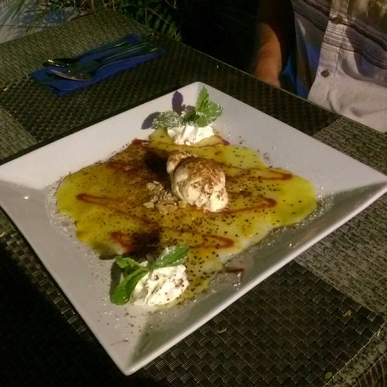 Carl had a duck shepherds pie for his entree and I had a creole mahi mahi dish. We finished with a dessert called pineapple carpaccio, which we came to realize later is quite common here. All of my dinner photos aren’t high quality because I used my phone. Flash photography with my Canon DSLR in a restaurant is beyond my skills.