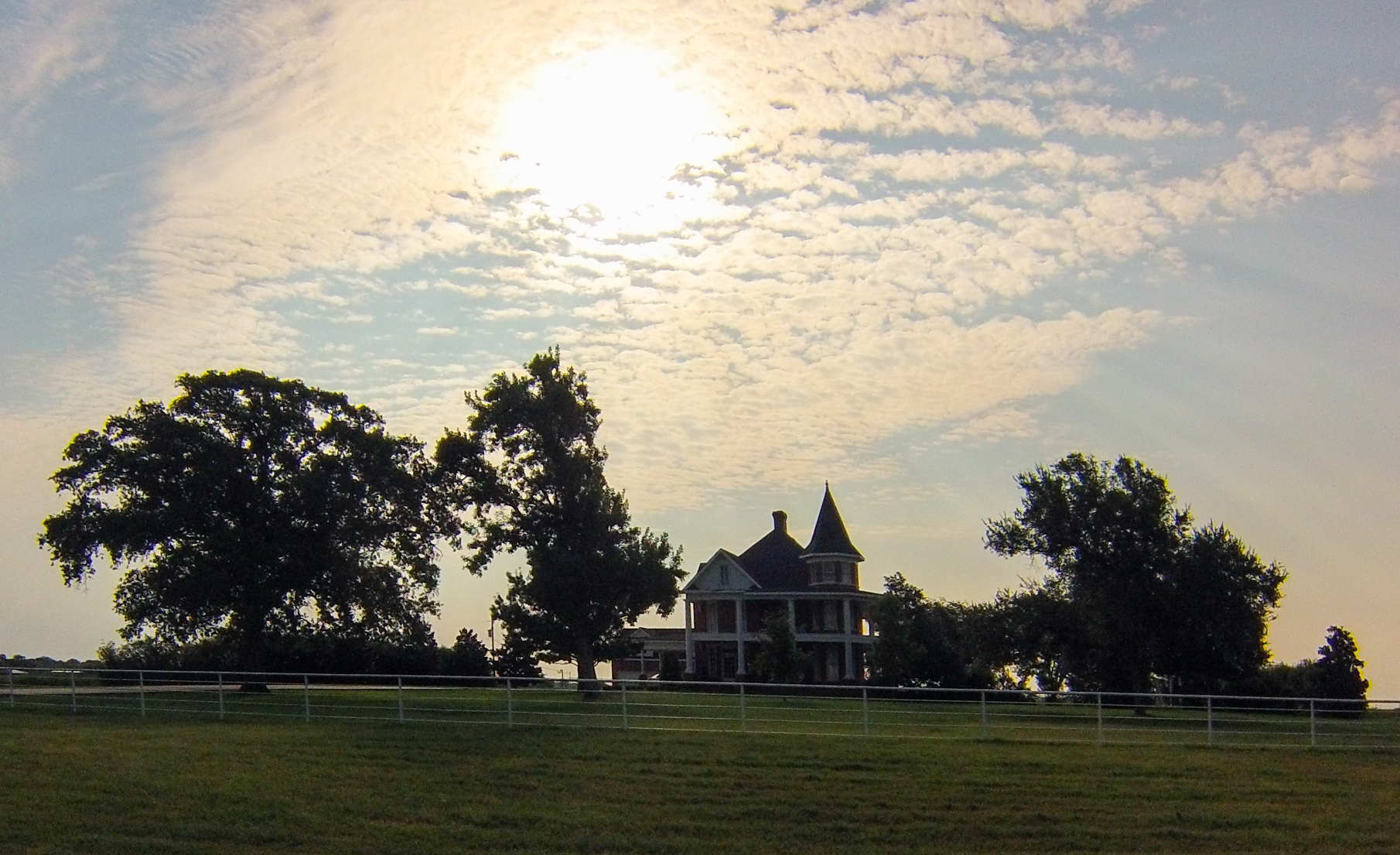 Wispy clouds over a giant country house: