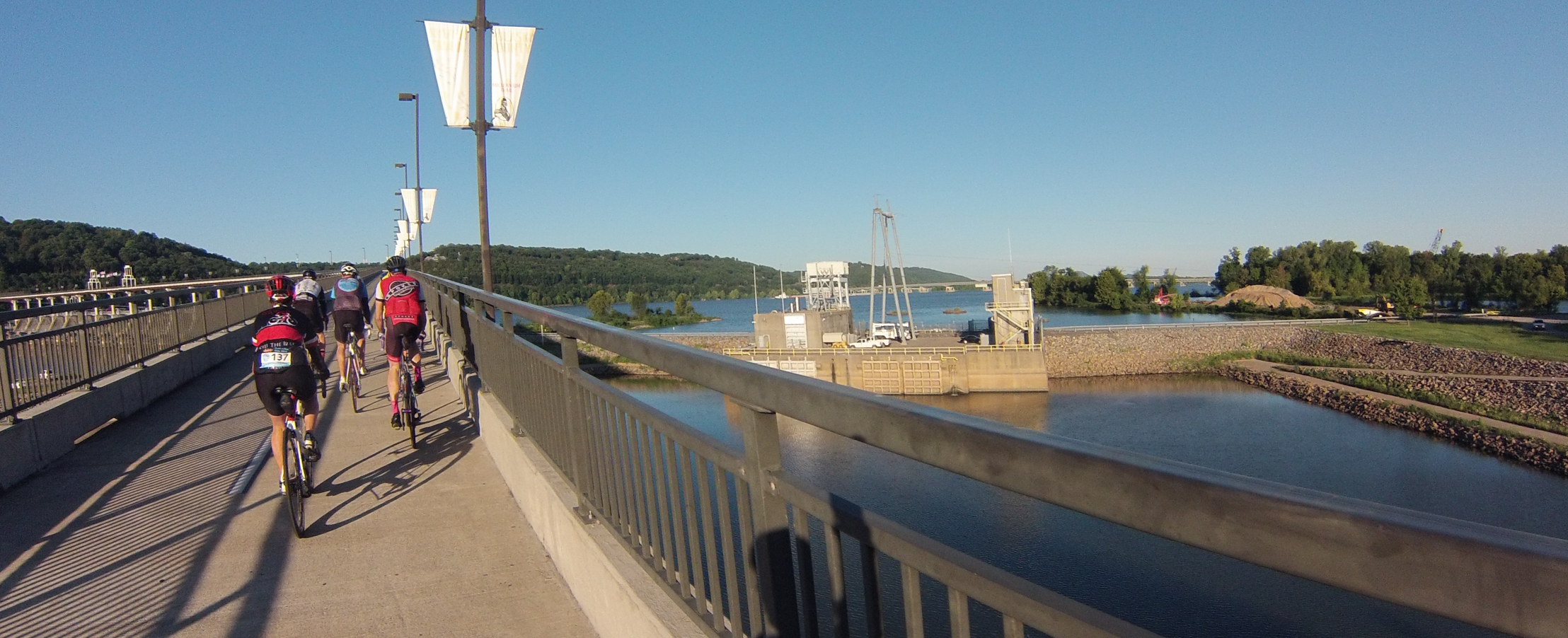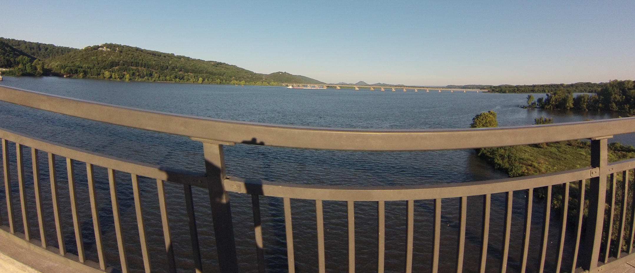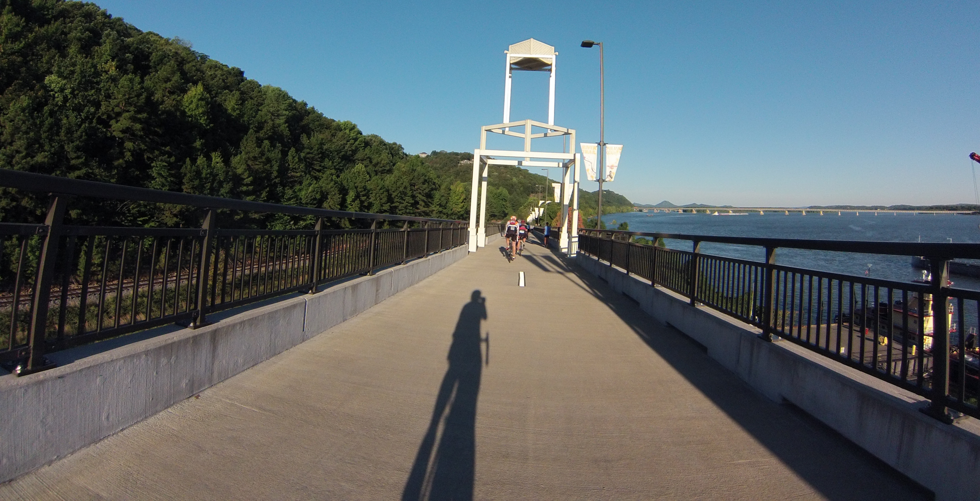 I met up with two other riders, one of whom works for Orbea, a Spanish bicycle manufacturer that recently set up US headquarters in Little Rock. After many hours of solitary riding between the two days it was nice to chat with friendly locals. In general the volunteers and cyclists in Arkansas were less friendly / talkative than the ones I’ve met in Texas. Approaching the first, smaller, pedestrian bridge: