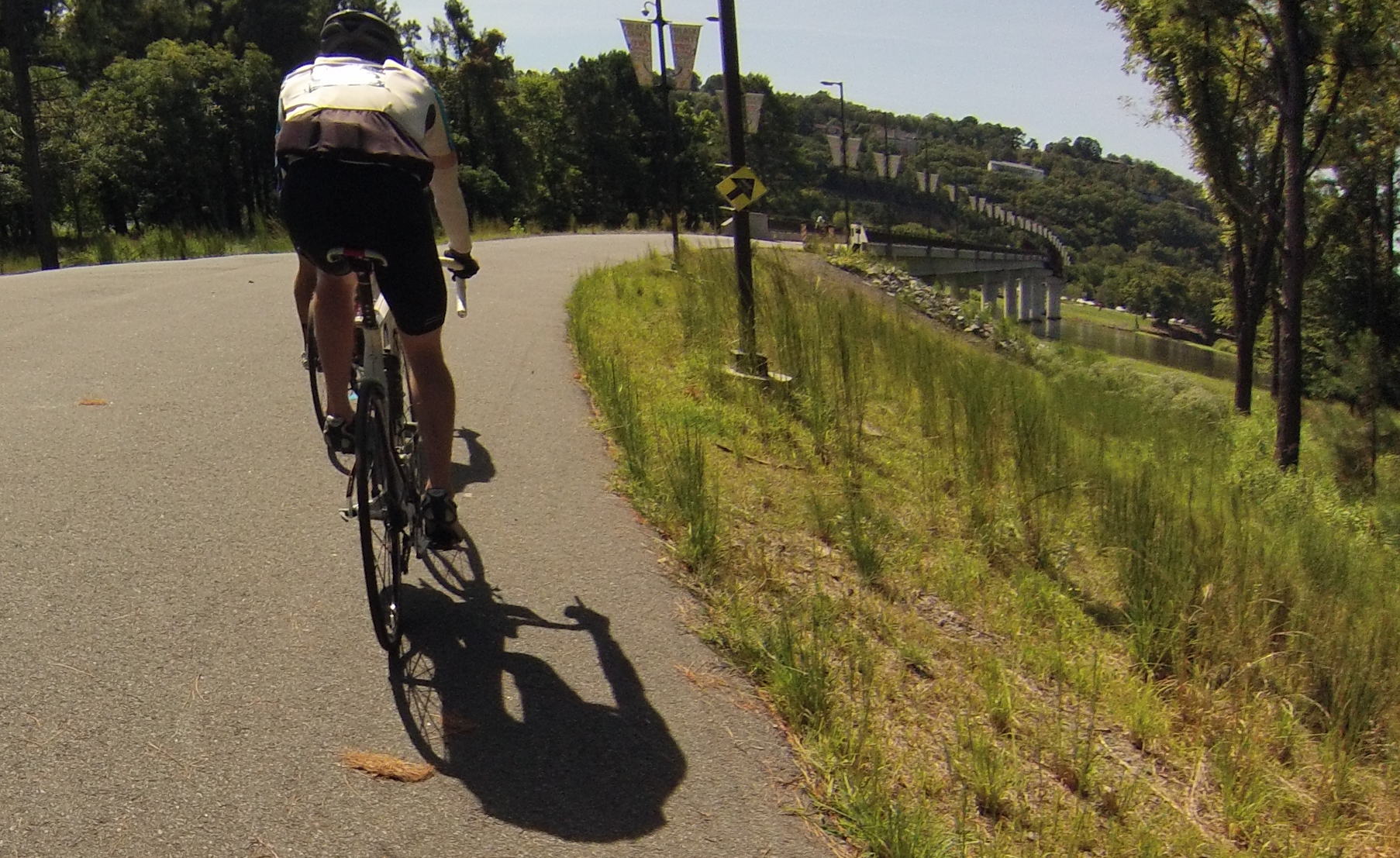 Riding up onto the second, longer pedestrian bridge spanning the Arkansas River:
