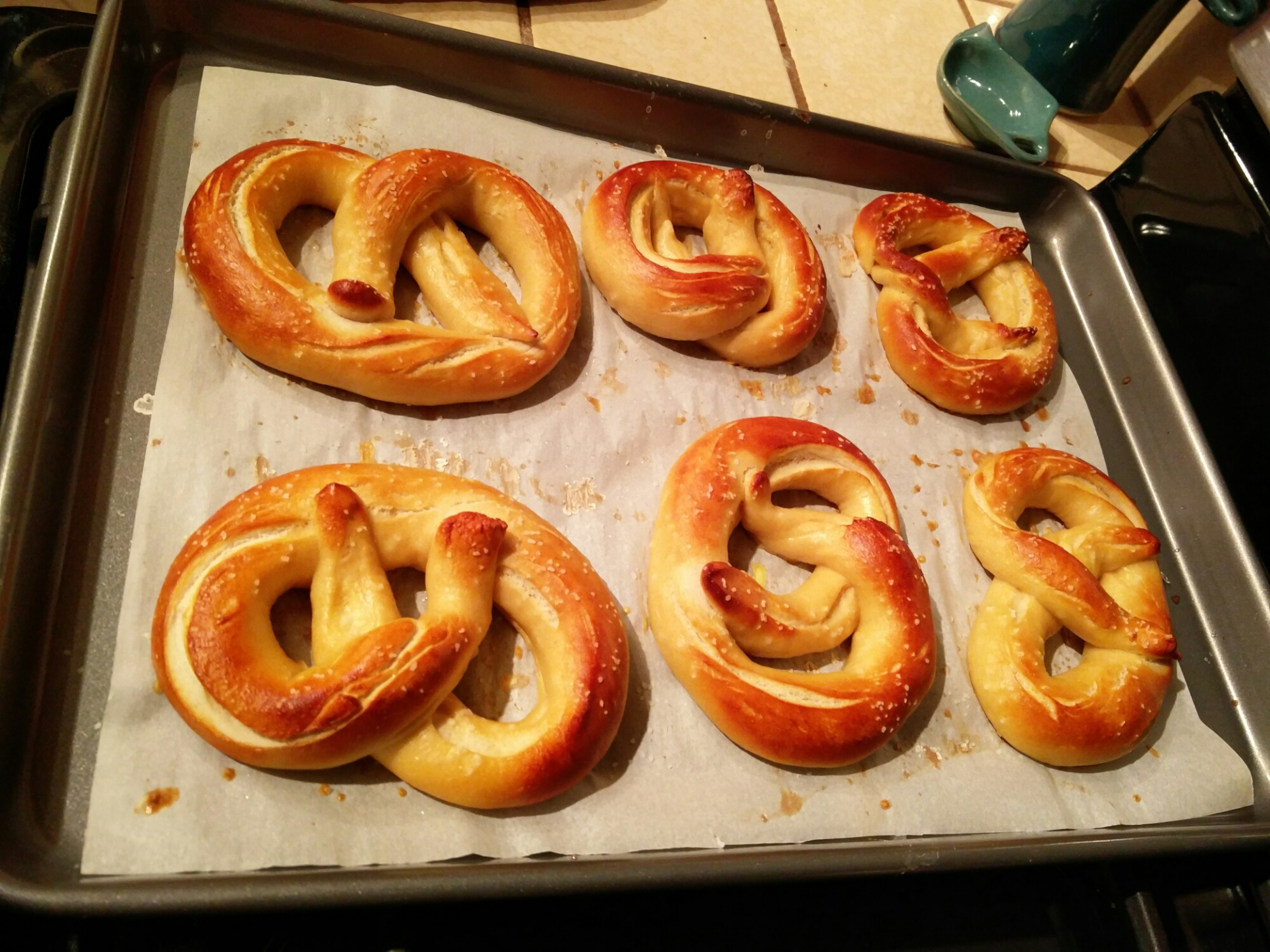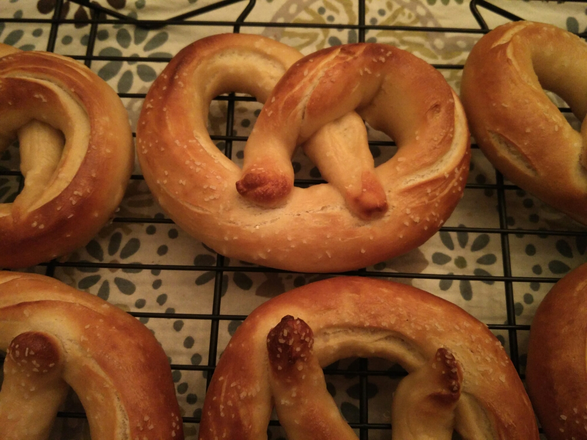 After a recent trip to Philadelphia, the land of soft pretzels, I came across the recipe for Alton Brown’s soft pretzels and figured it was a sign that I should make them. The technique is fairly straightforward, make the dough, let it rise, divide and roll it out, form pretzels, dunk in pretzel bath, apply egg wash, and bake.