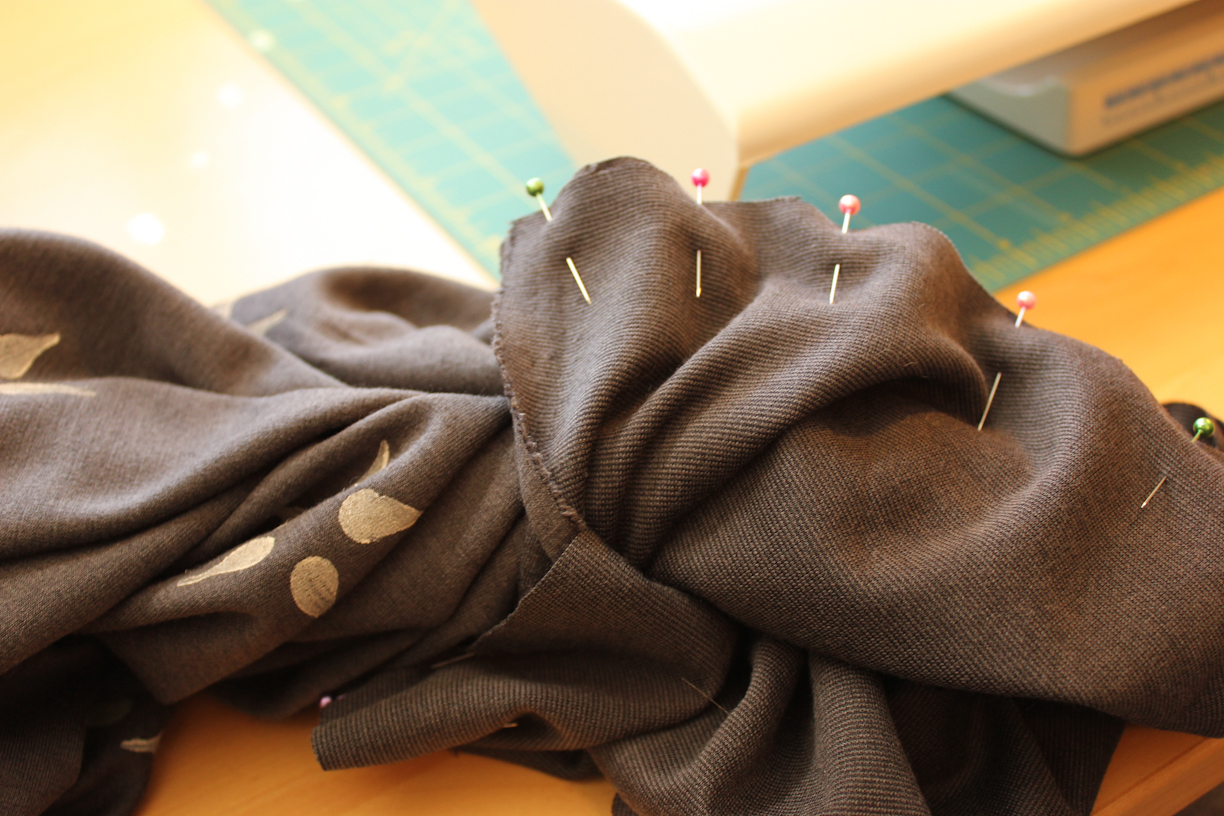 Next, you have to pin the ends of the fabric together, which is what feels a bit tricky. This is the part where you actually join your scarf into a loop. You start with matching corners and keep the correct side of the fabric facing in so that it touches the entire time you are pinning. Continue to pin around in a circle until you hit the other corners. The extra four inches you left on each side of the scarf is what allows you to do this – the rest of the fabric ends up being contained in those 8 inches after you are done pinning.
