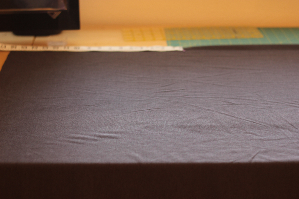 I cut my knit fabric in half, so that I had two pieces of fabric, 1.5 yards long by 24 inches wide. Because you fold the fabric in half length wise and sew, this gives a scarf about about 12 inches wide (minus seam allowances). I got a nice dark brownish/grayish knit fabric with a small weave.