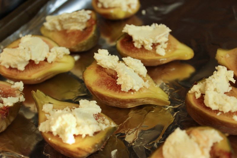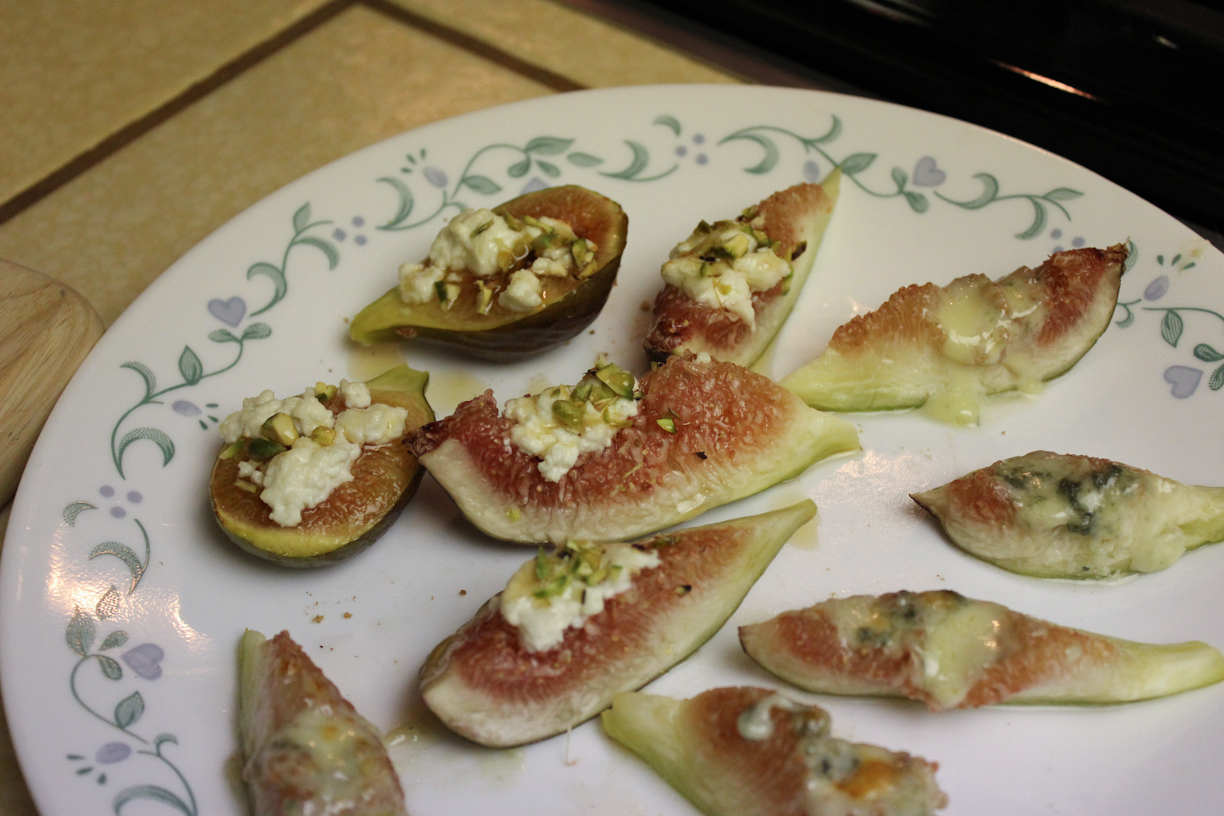 Figs topped with goat cheese and gorgonzola, ready to be eaten