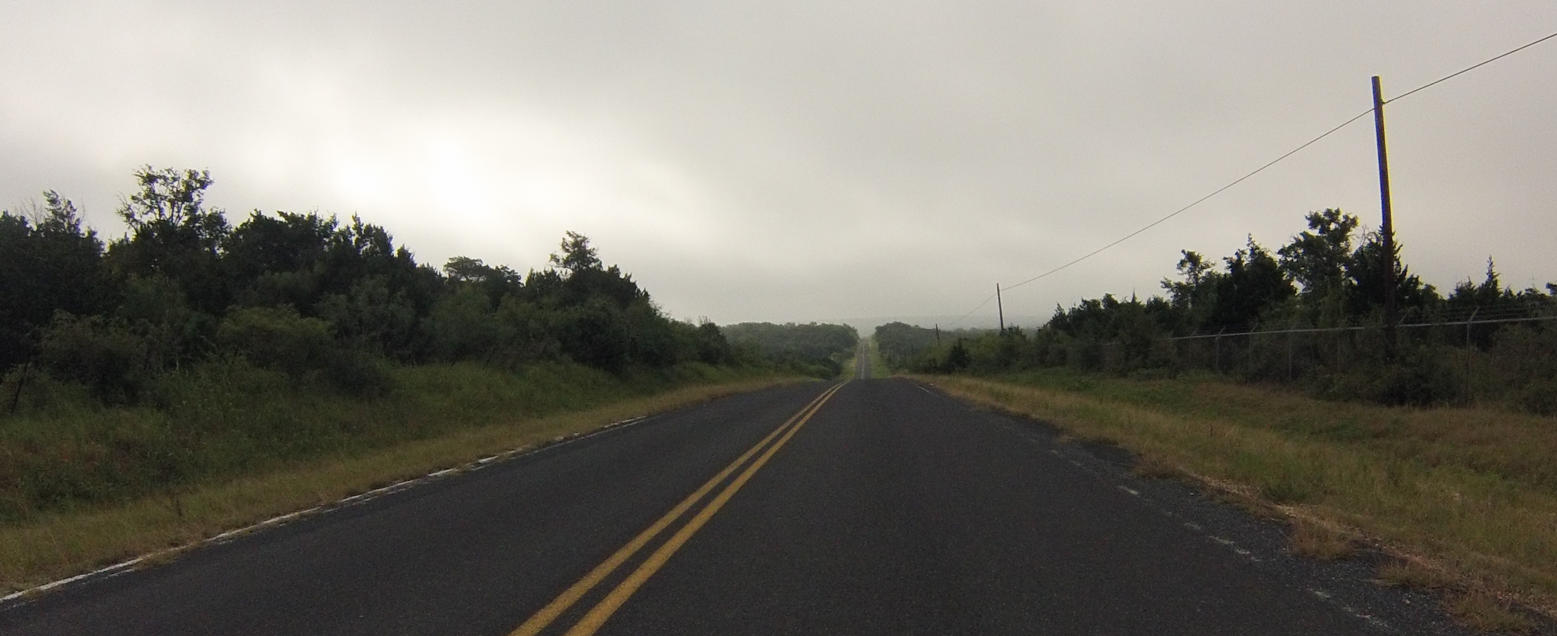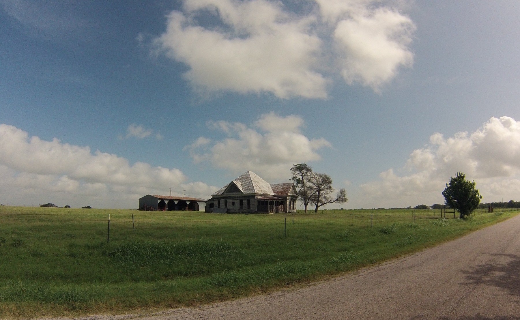 I saw 3 deer high-tailing it across a field towards the road I was riding on. You can just barely make them out between the two trees behind the little pond. While the GoPro takes nice landscape photos it does not zoom at all.