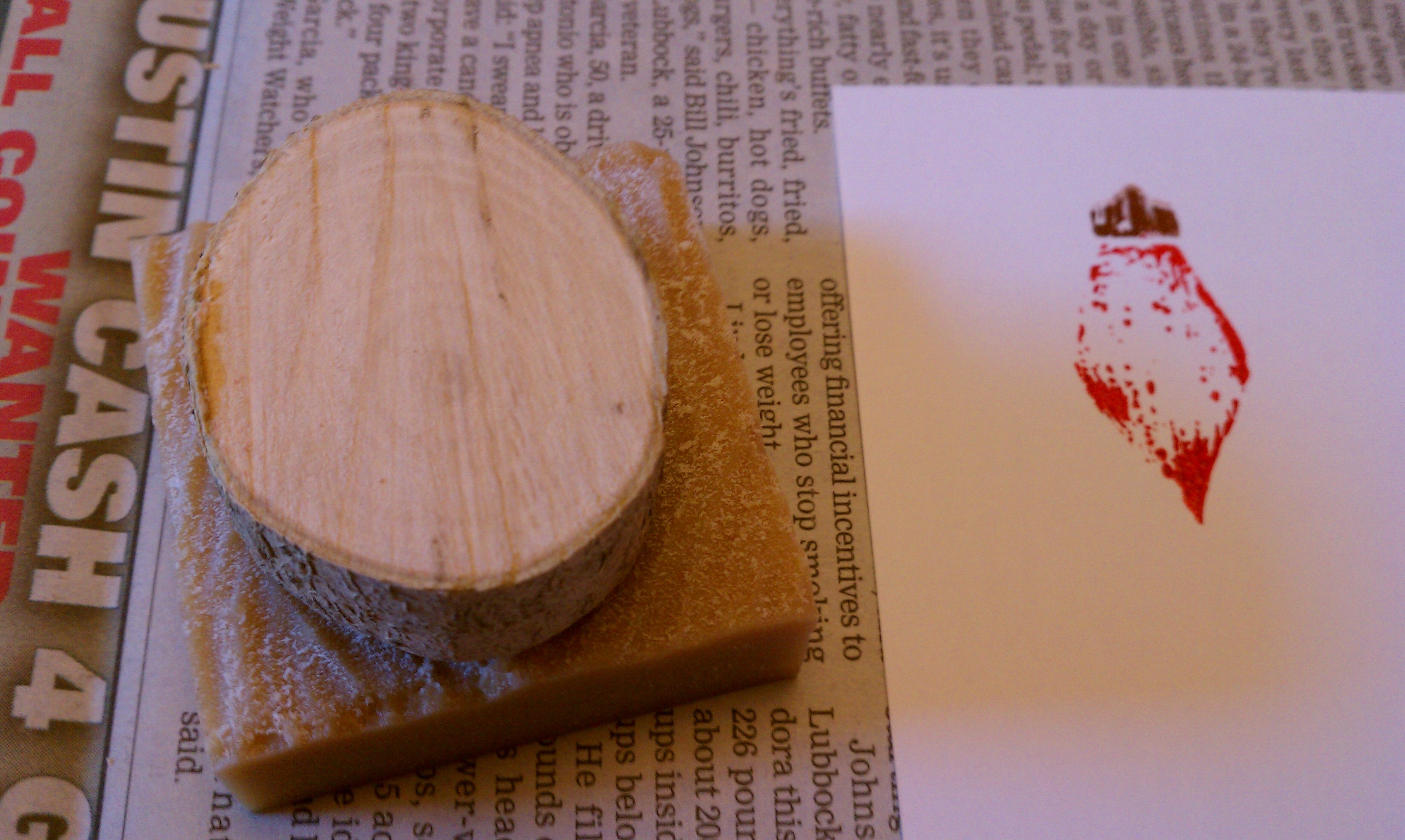 I found that it worked best to lay the stamp on the table, place the wood slice on top of it, and press down with firm (but not hard) pressure. This helped transfer the paint to the wood even if some small ridges remained after the sanding step.