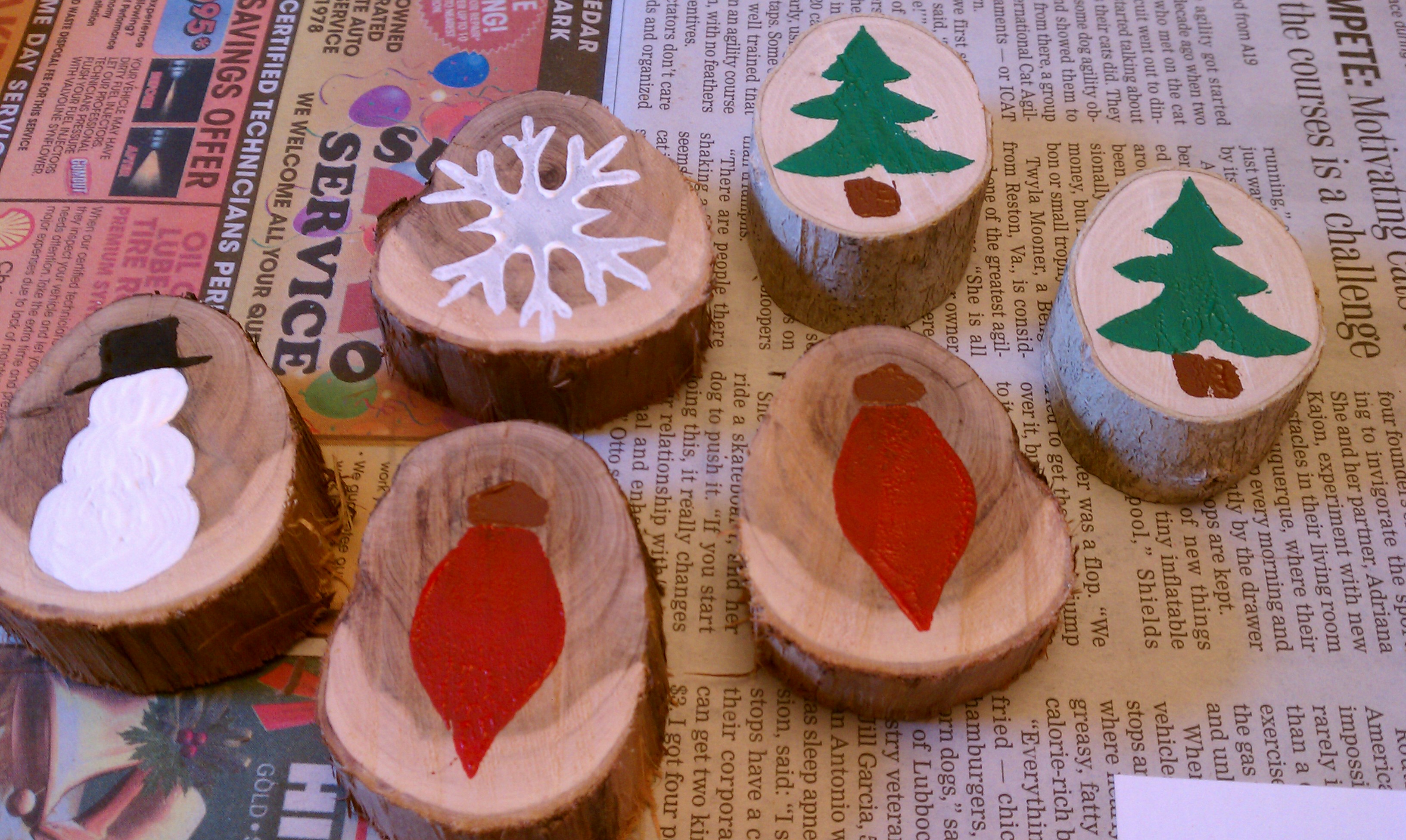 I like to create my own linocuts (a print-making method) so I decided to create reproducible designs by basically making holiday stamps for my wood slices. You could also simply buy stamps or paint a design if cutting your own stamps isn’t your thing.